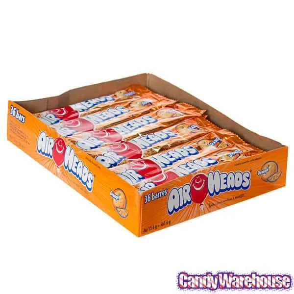Display box contains 36 Orange AirHeads Taffy Candy Bars, each with a net weight of 0.55 ounce.