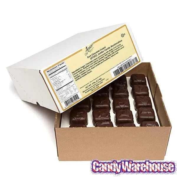 Box contains 5 pounds of Jumbo Dark Chocolate Covered Marshmallows Candy…that’s about 75 pieces.