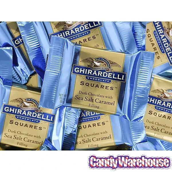 Display box contains 50 wrapped Ghirardelli Dark Chocolate with Sea Salt Caramel Filling Squares.