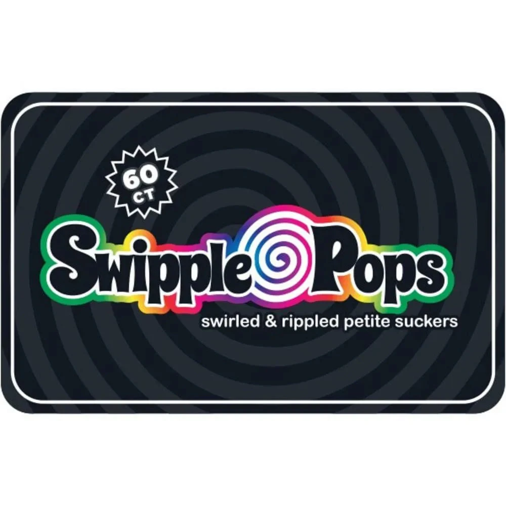 Tub contains 60 individually wrapped Rainbow Swipple Pops Petite Swirly Ripple Lollipops.